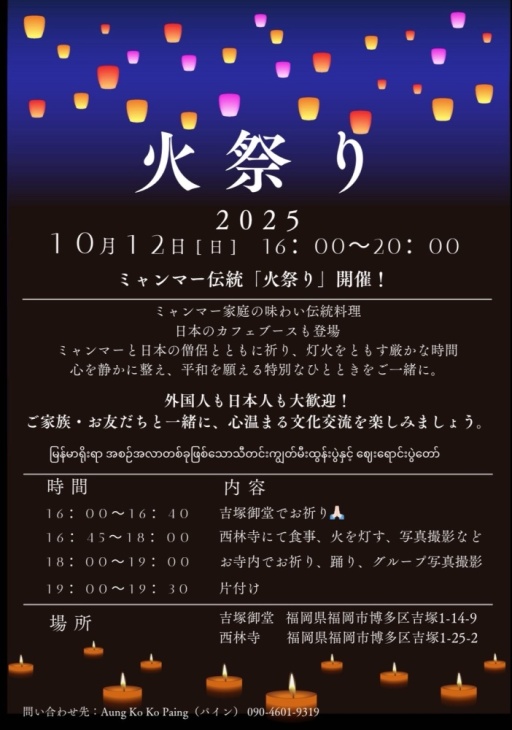 ミャンマーの仏教行事であり母国では祭日にあたるこの日、吉塚御堂&西林寺にて、ミャンマーの皆さん主催で開催します。
