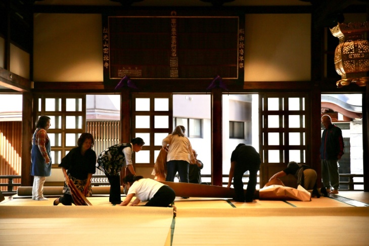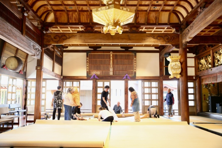 最後は外陣に絨毯を敷いて冬支度。報恩講をお迎えする準備が整いました。
