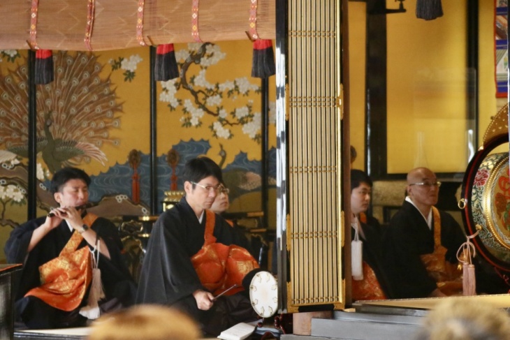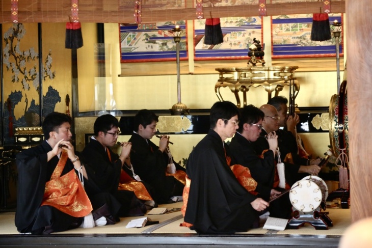 法要二日目には、那珂組白鵠会の皆さんにもご出勤いただき、美しい雅楽の音色の中、賑々しく初夜礼讃をおつとめしました。