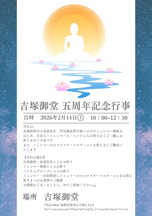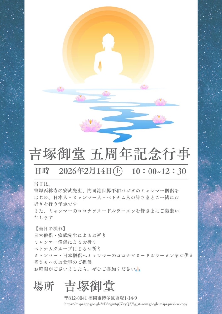 2026年2月14日(土)朝10時より、吉塚市場リトルアジアマーケット内にある吉塚御堂において『吉塚御堂 五周年法要』を厳修します。